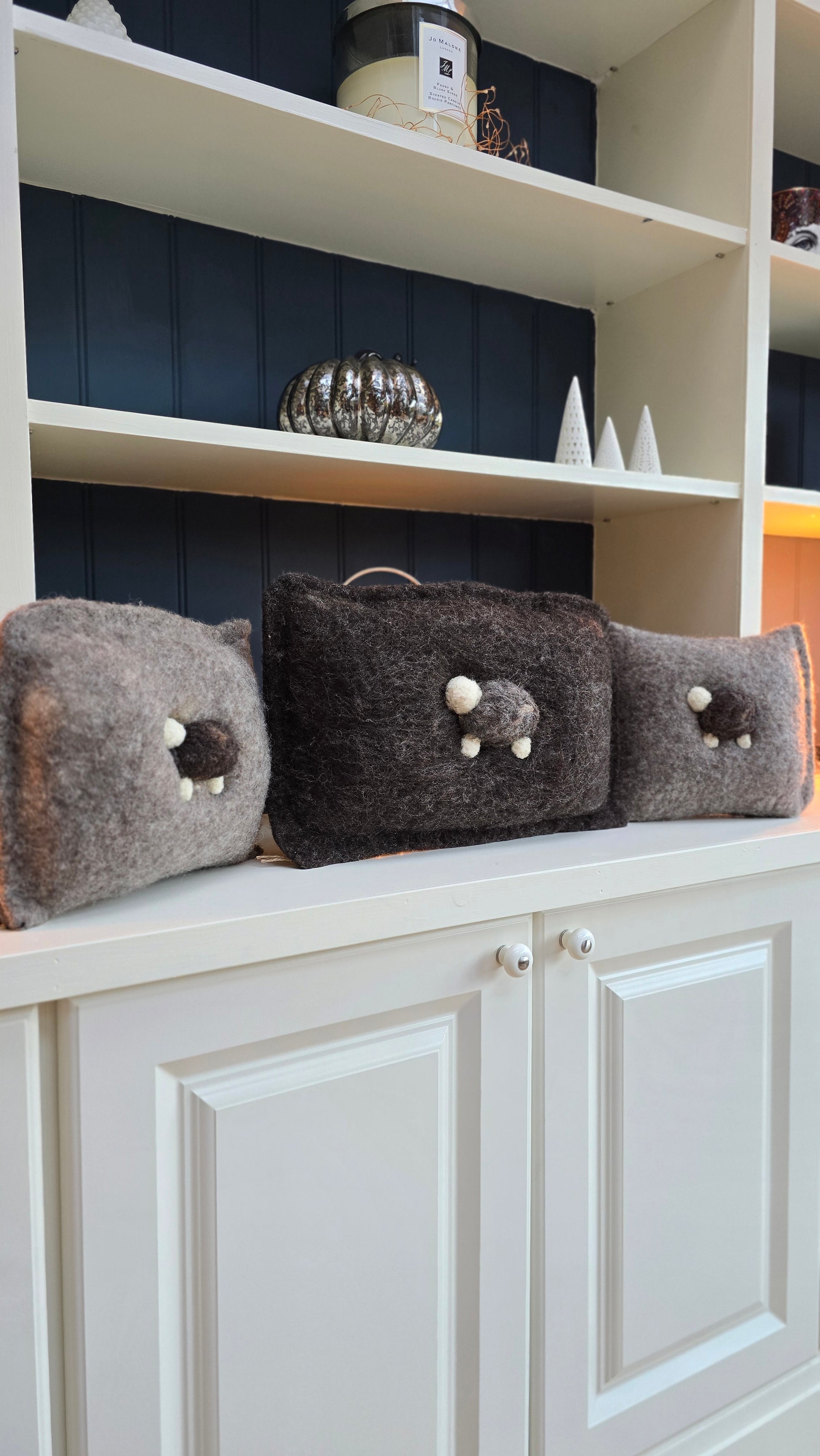 • Grey cushion & dark sheep: Wet felted outer and stuff with a mix of Lleyn and Texel fibres. Needle felted closed edges. 25cm x 20cm